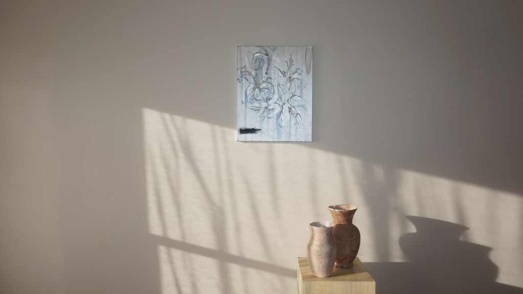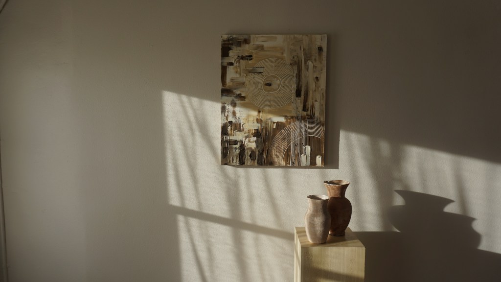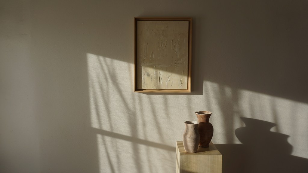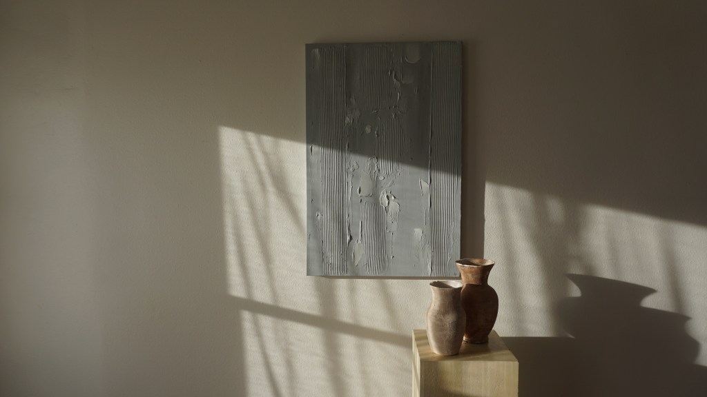 The layered abstractions are inspired by the quiet, intentional rhythms of life, with each layer holding tension between rigidity and flow.